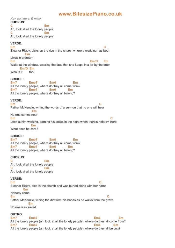 ChordsThe Beatles ELEANOR RIGBY – THE BEATLES PIANO CHORDS & Lyrics 29th October 2021 bitesizepiano Piano chords and lyrics for Eleanor Rigby by The Beatles. Includes piano tutorial. Eleanor Rigby – The Beatles Piano Tutorial Share this: Click to share on Facebook (Opens in new window) Facebook Click to share on X (Opens in new window) X Related